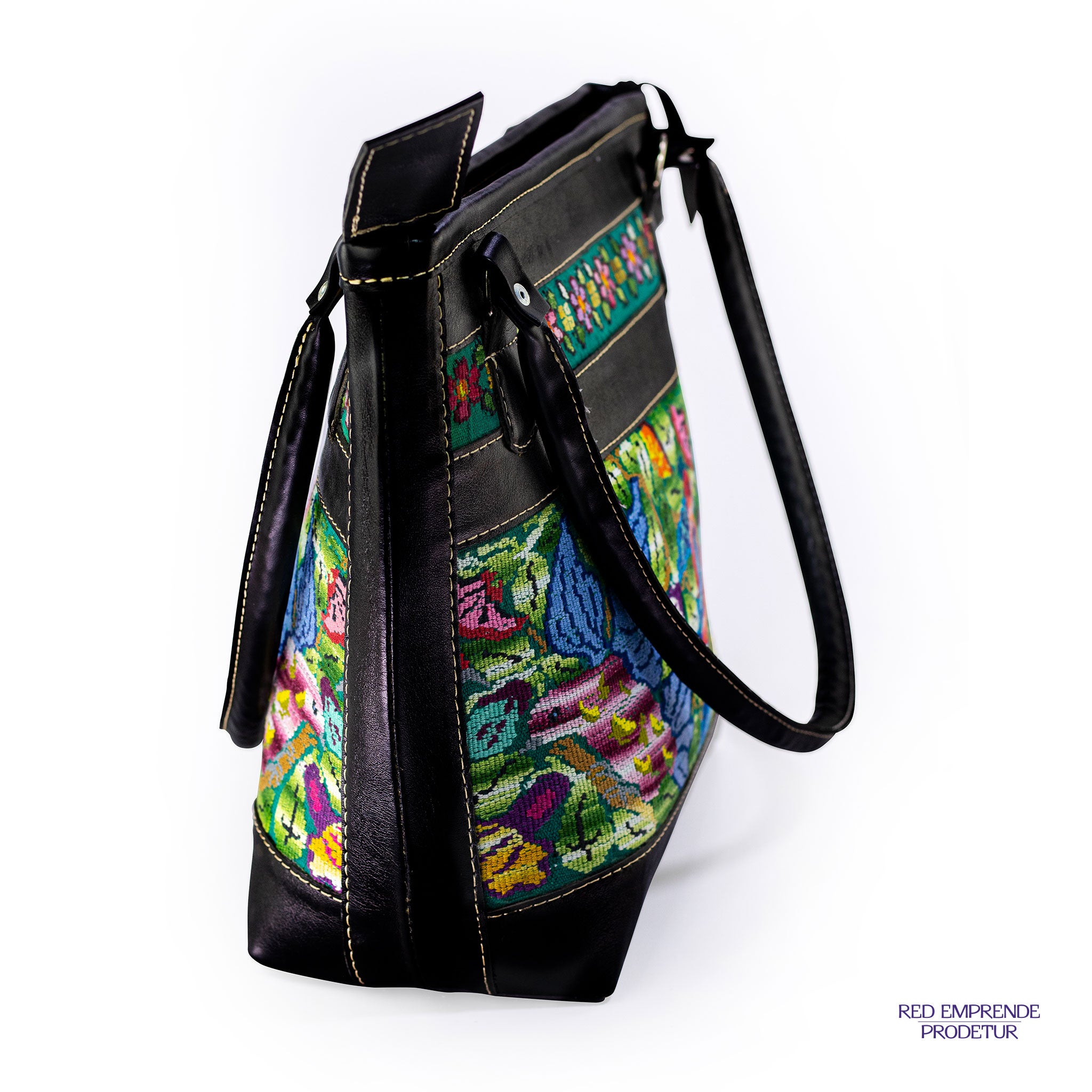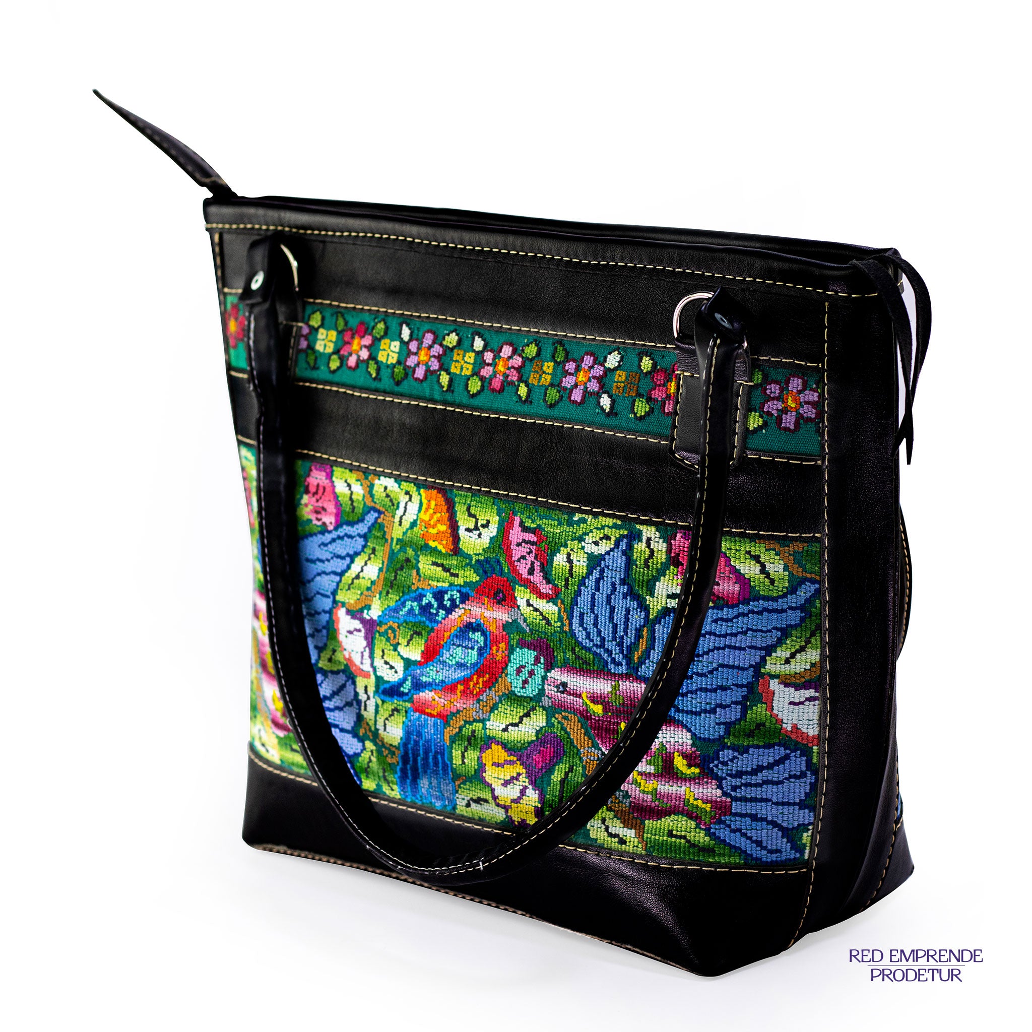 Bolsa fabricada con cuero negro y tejido verde con colibrís y flores, tejido en San Antonio Aguas Calientes.
