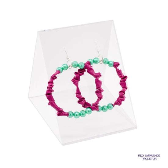 Aretes con alambre, perla nacarada y globo reciclado, color fuscia con verde menta, Tamaño 7cm.