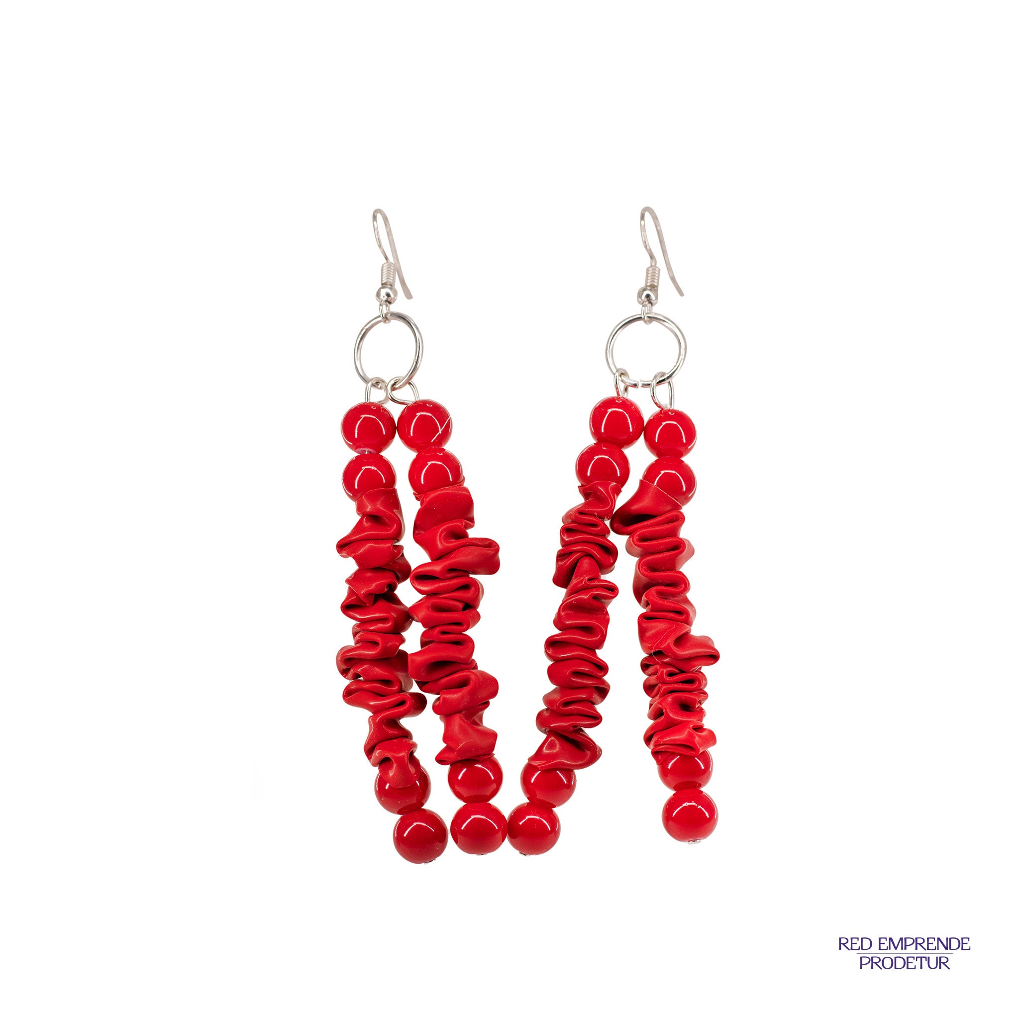 Aretes con alambre, globo reciclado y perla. Color rojo con perlas rojas. Tamaño 7.5 cm.