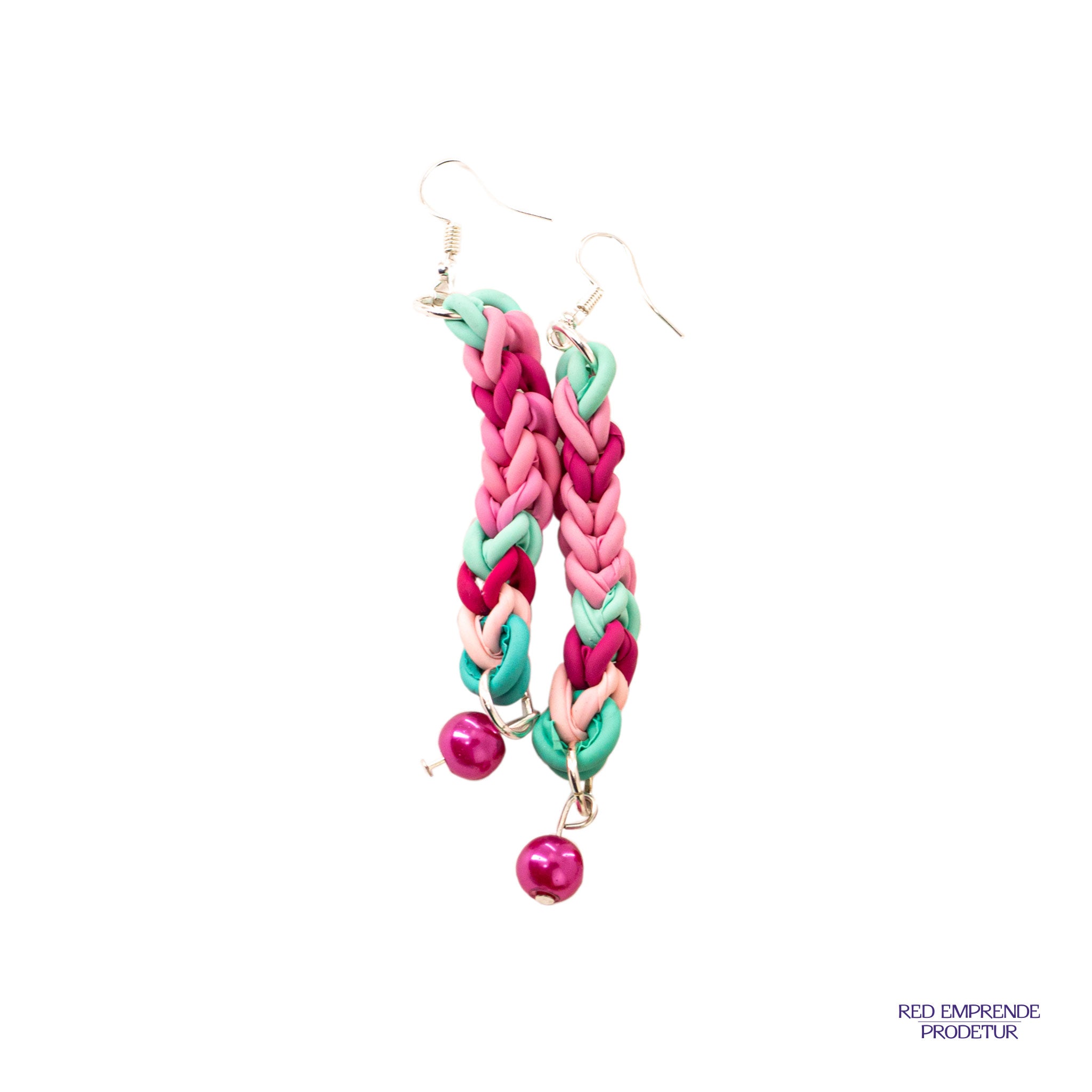 Aretes tejidos de globos rosado y turquesa con perlas fuscia.