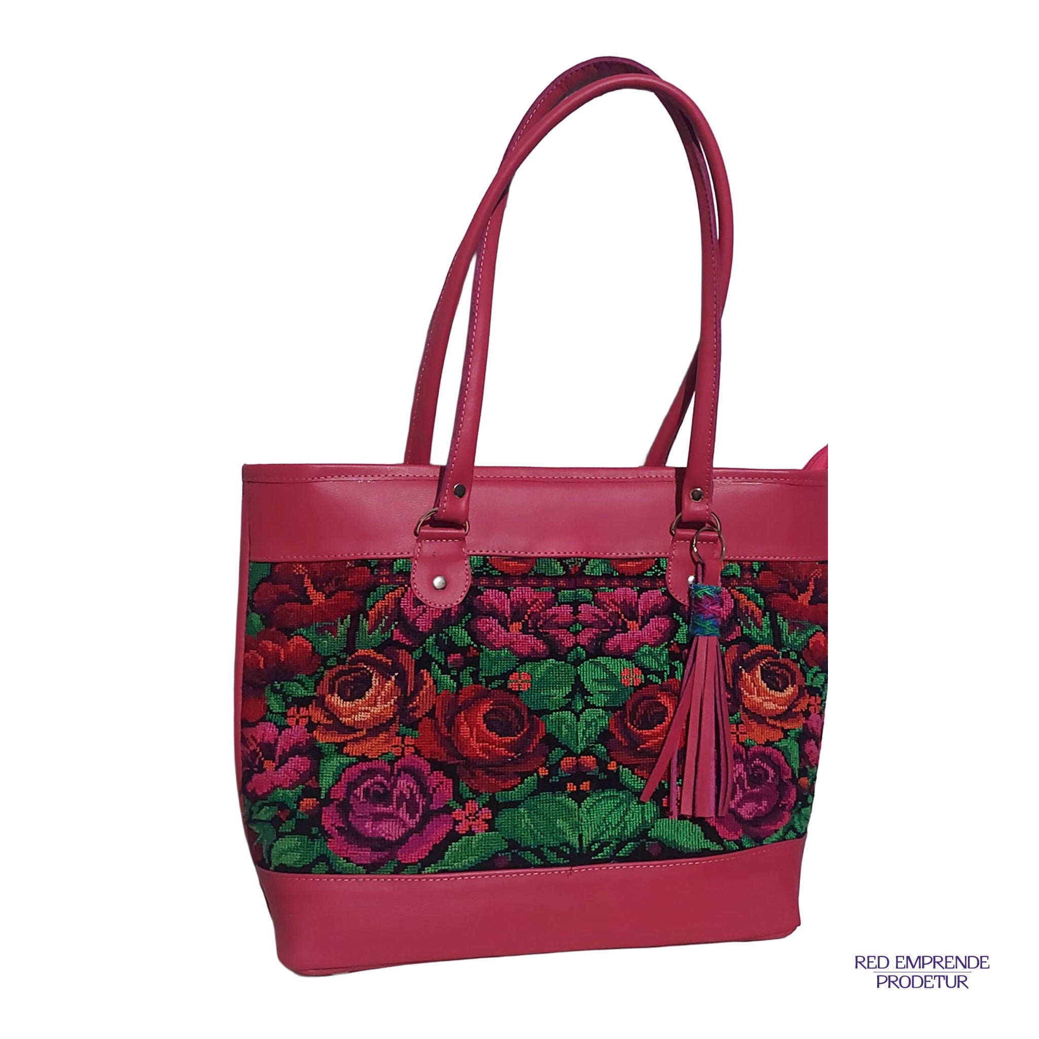 Fabricada con piel corinto, bordado con diseños de rosas, rojo y naranja y hojas verdes. Tejido de San Antonio Aguas Calientes. Tejido de un solo lado, la parte de atrás una línea pequeña de tejido de colores pequeña con zipper. Tamaño 27cm alto por 38cm de ancho.