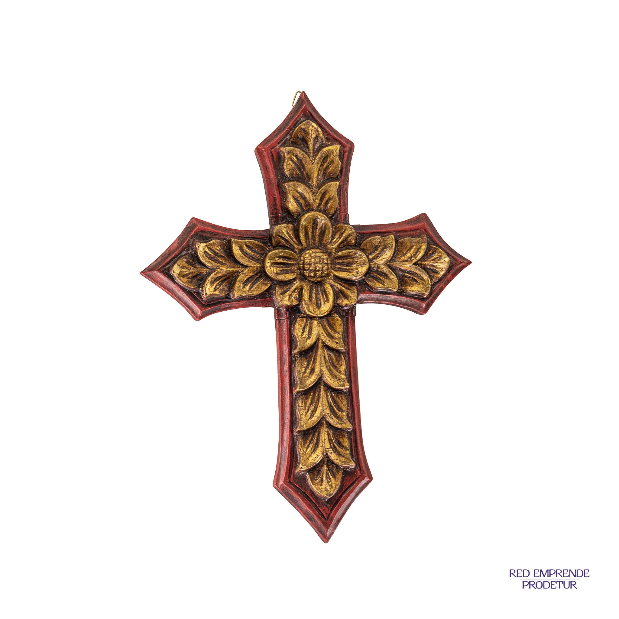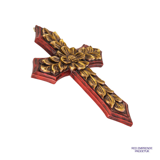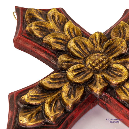 Cruz dorada con rojo, elaborado en madera de cedro con lámina de oro italiano. Tamaño 24x32 cm.