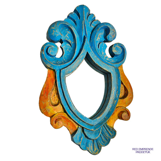 Espejo tallado en madera de cedro en forma de escudo, marco color amarillo con celeste. Tallado de cedro. 23 cm de alto y 15.5 cm ancho.