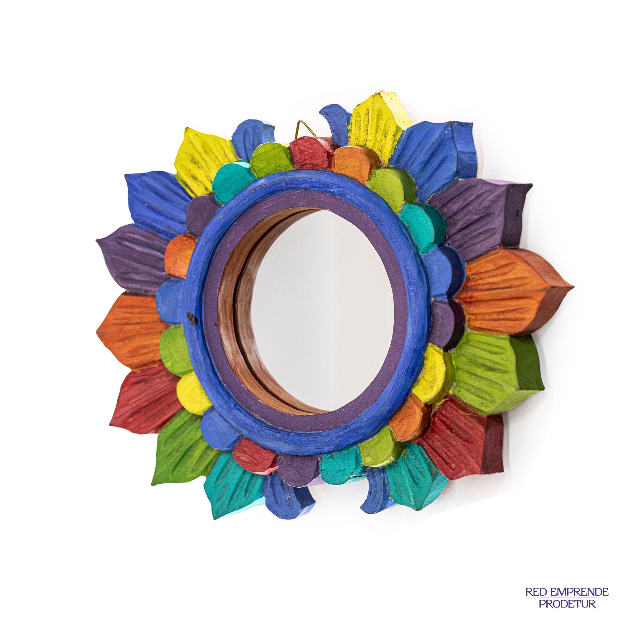 Espejo circular con marco de forma Girasol. Tallado en cedro. 23 cm de largo y 18 cm de ancho.