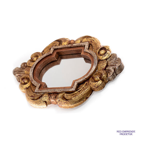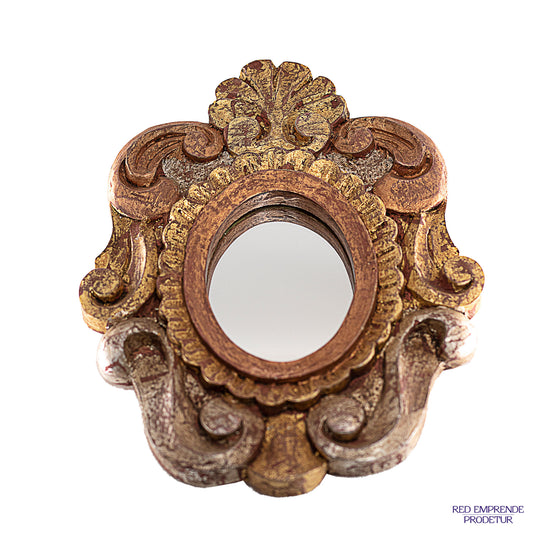 Espejo laminado, tallados de cedro, espejo circular, color café, pintado con laminado de dorado y plateado, con detalles rojos. 23 cm de alto y 18.5 cm de ancho.