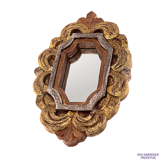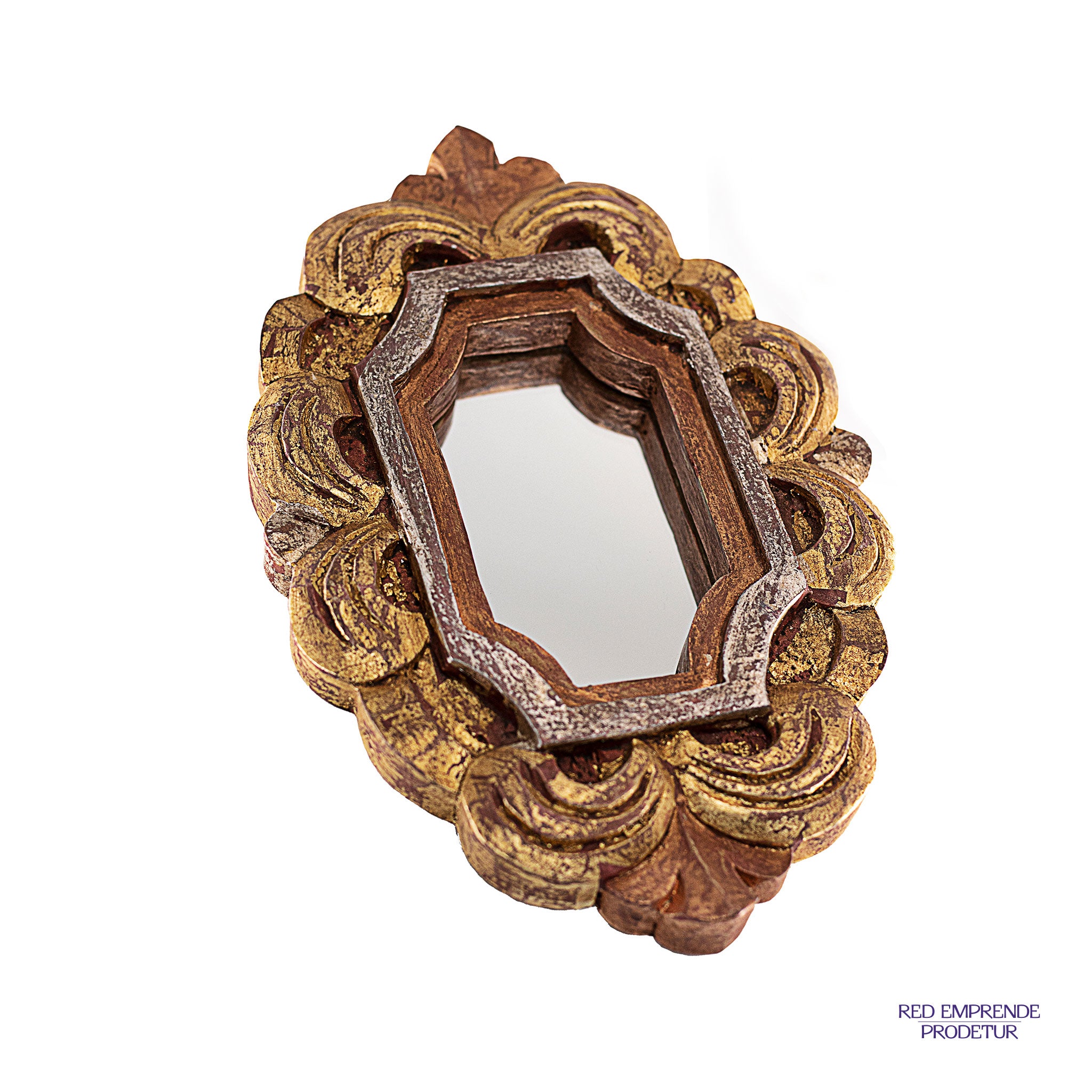 Espejo laminado, tallados de cedro, espejo rectangular con esquinas ovalados, color café, pintado con laminado de dorado y plateado. 24 cm de alto y 15 cm de ancho.