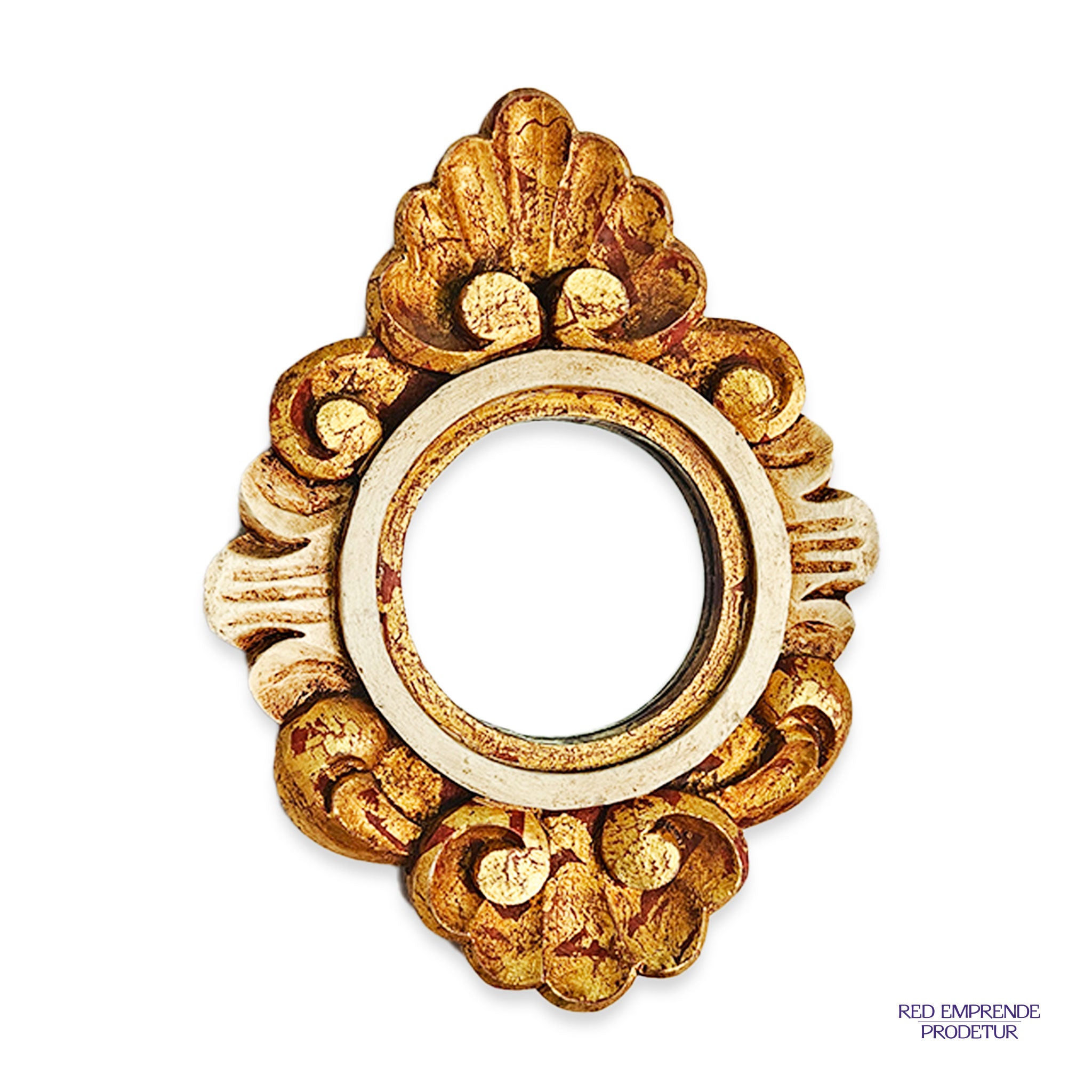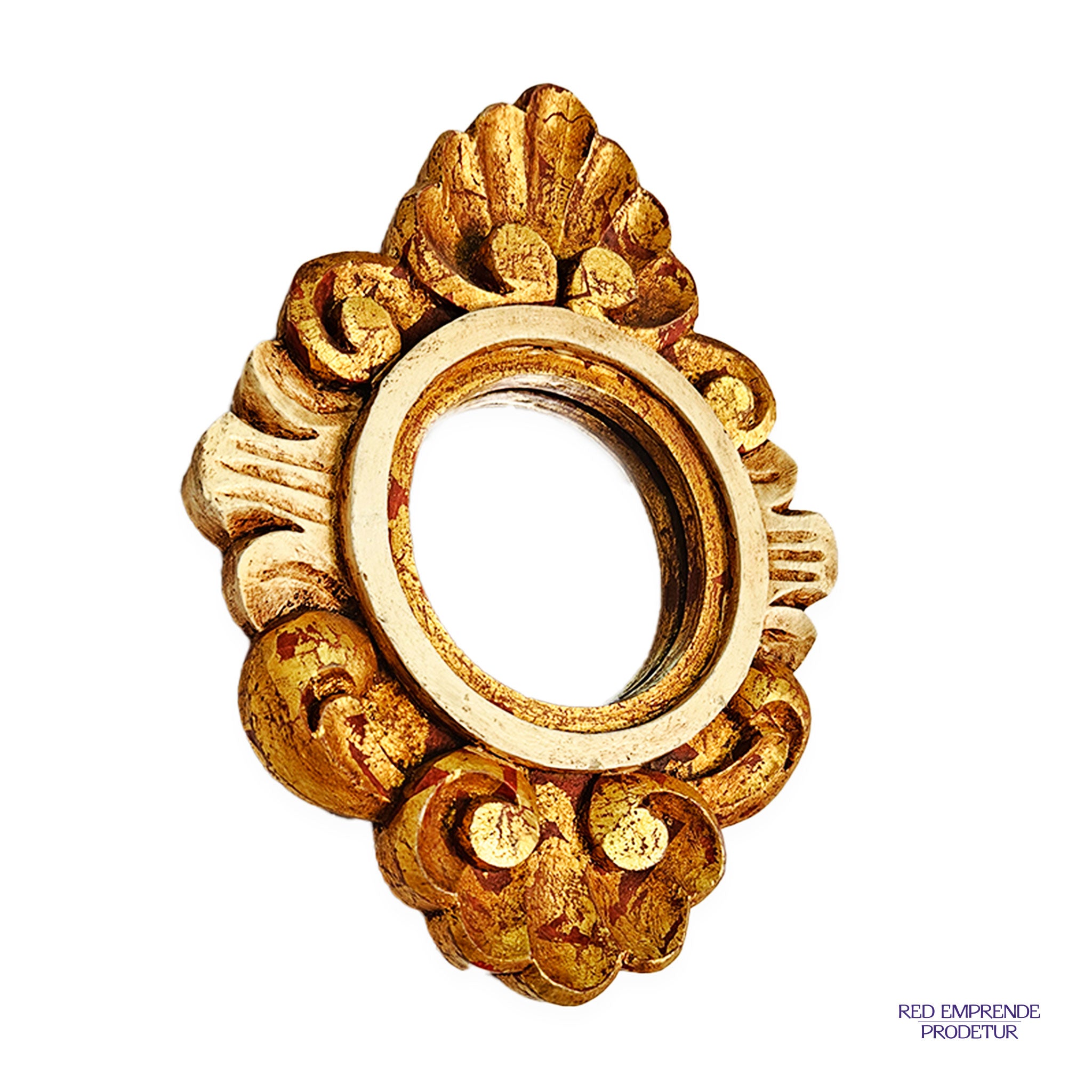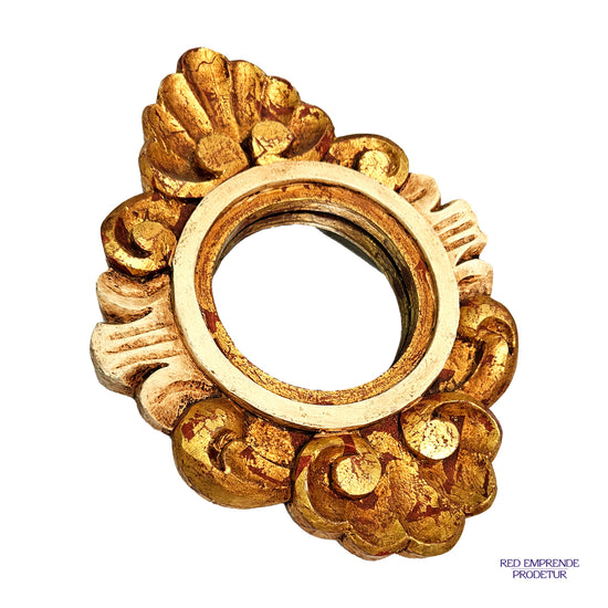 Espejo laminado, tallados de cedro, espejo forma circular, color café, pintado con laminado de dorado y plateado. 25cm de alto 18cm de ancho.