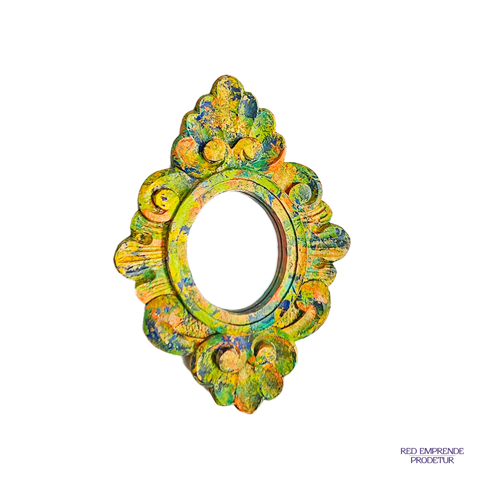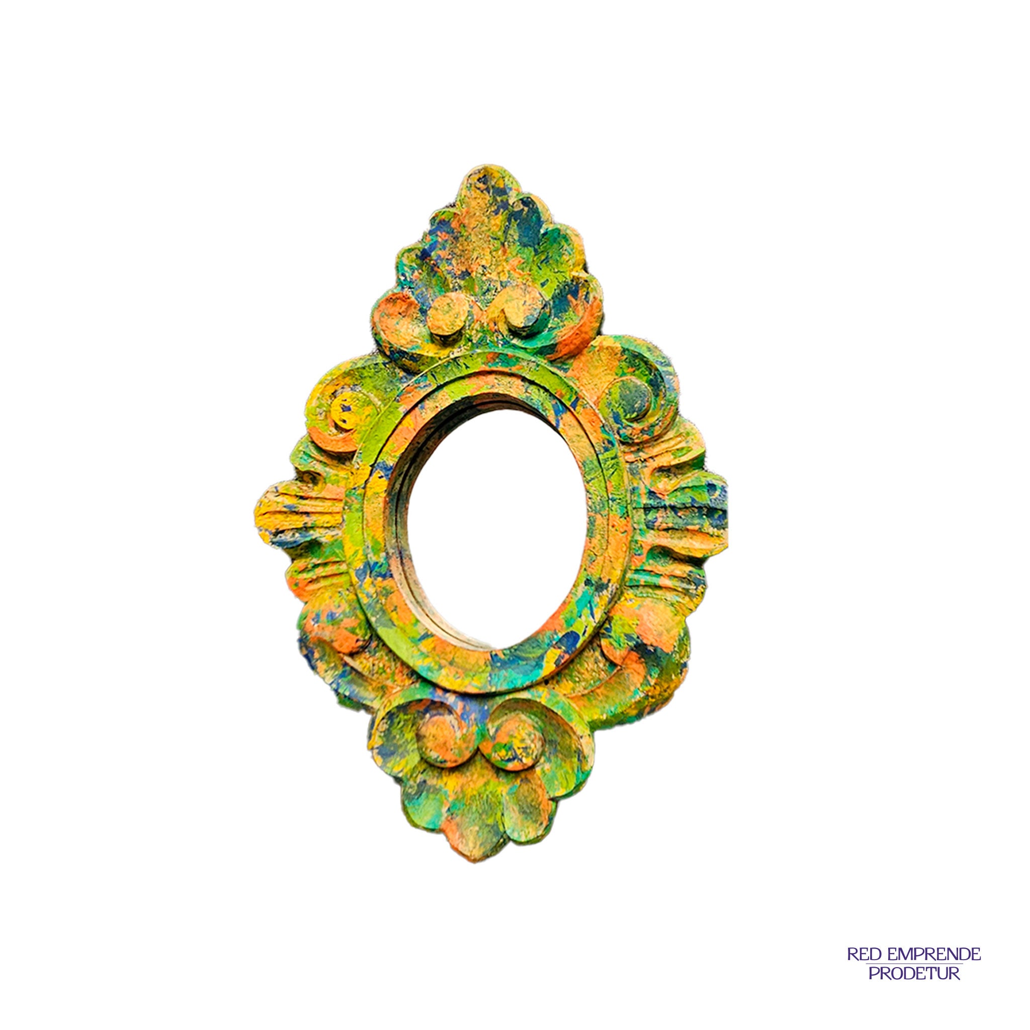 Espejo ovalado, marco de manchas de diversas colores. Tallado en madera de cedro. De 25 cm de alto y 18 cm de ancho.