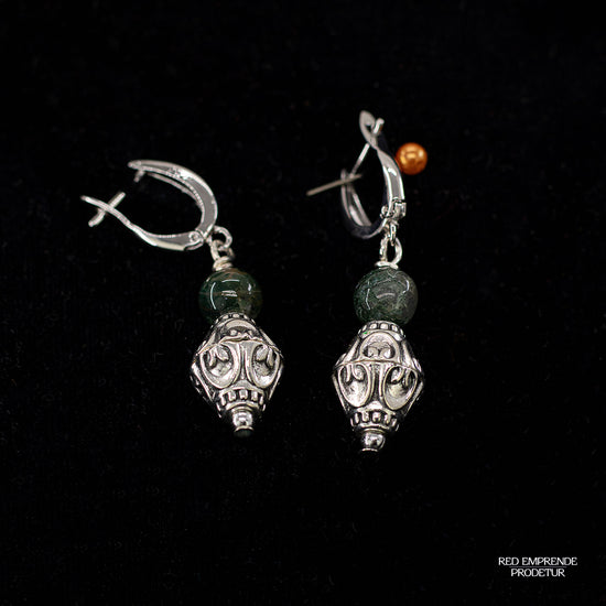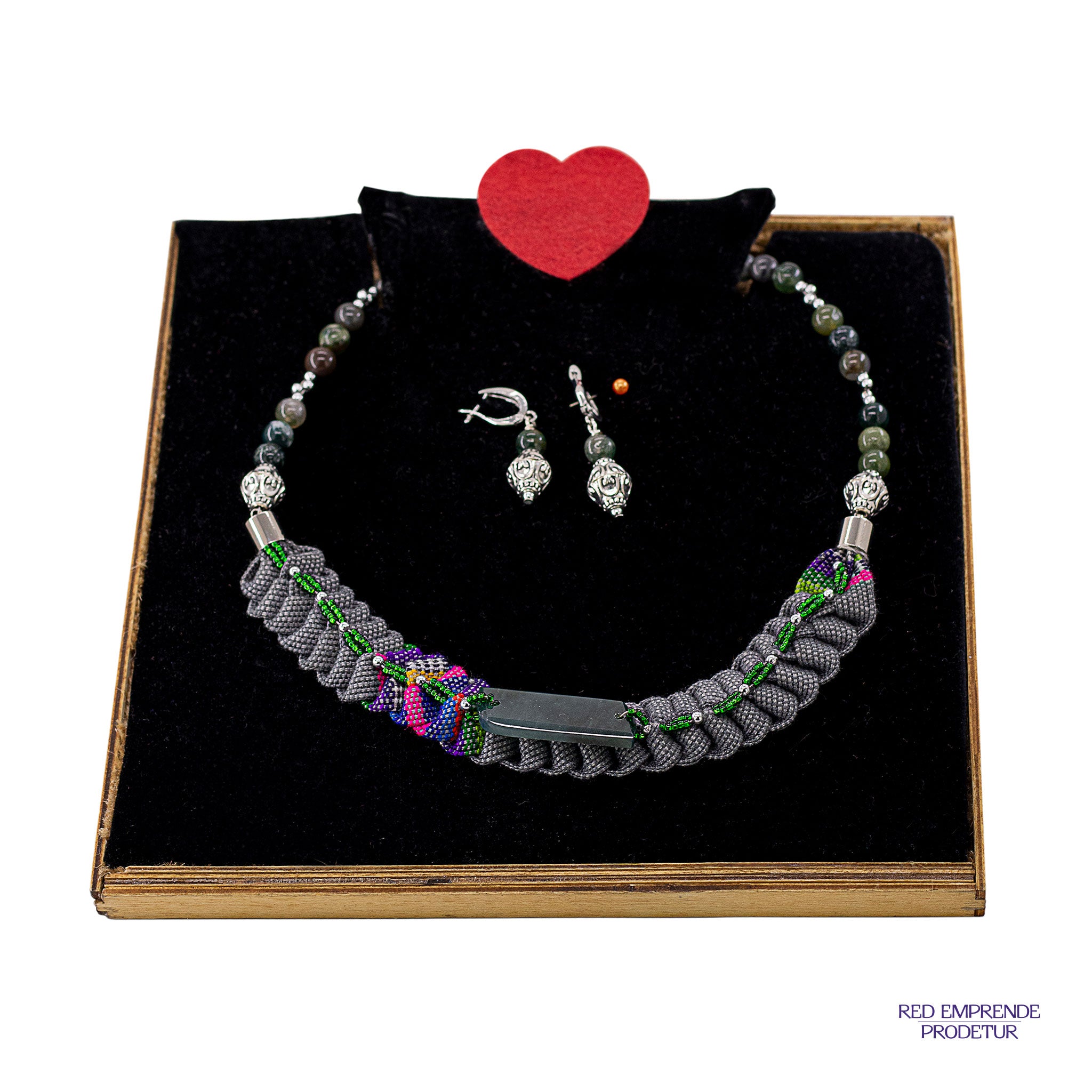 Juego de collar elaborado con tela típica y trenzado con jade y piedra jaspe y aretes de corazón. Set de 1 par de artes y un collar.