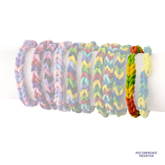 Pulsera tejidas de globos reciclados color naranja, verde claro y amarillo