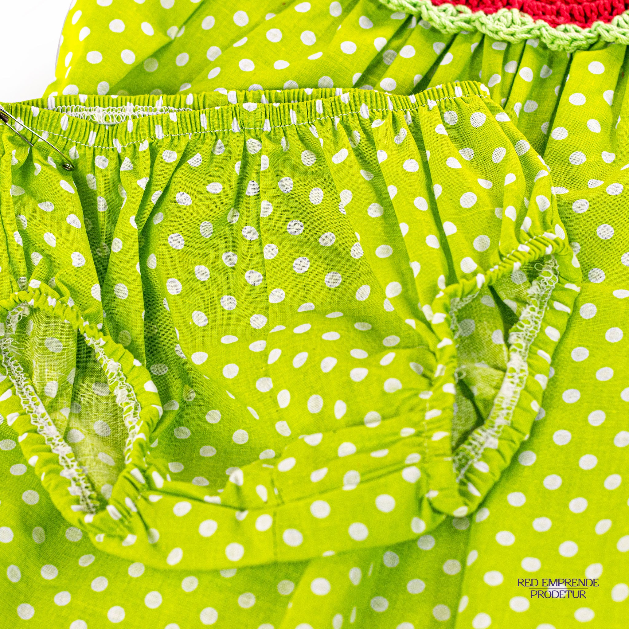 Vestido para bebé, color fresa con verde tejido en hilazo de algodón.