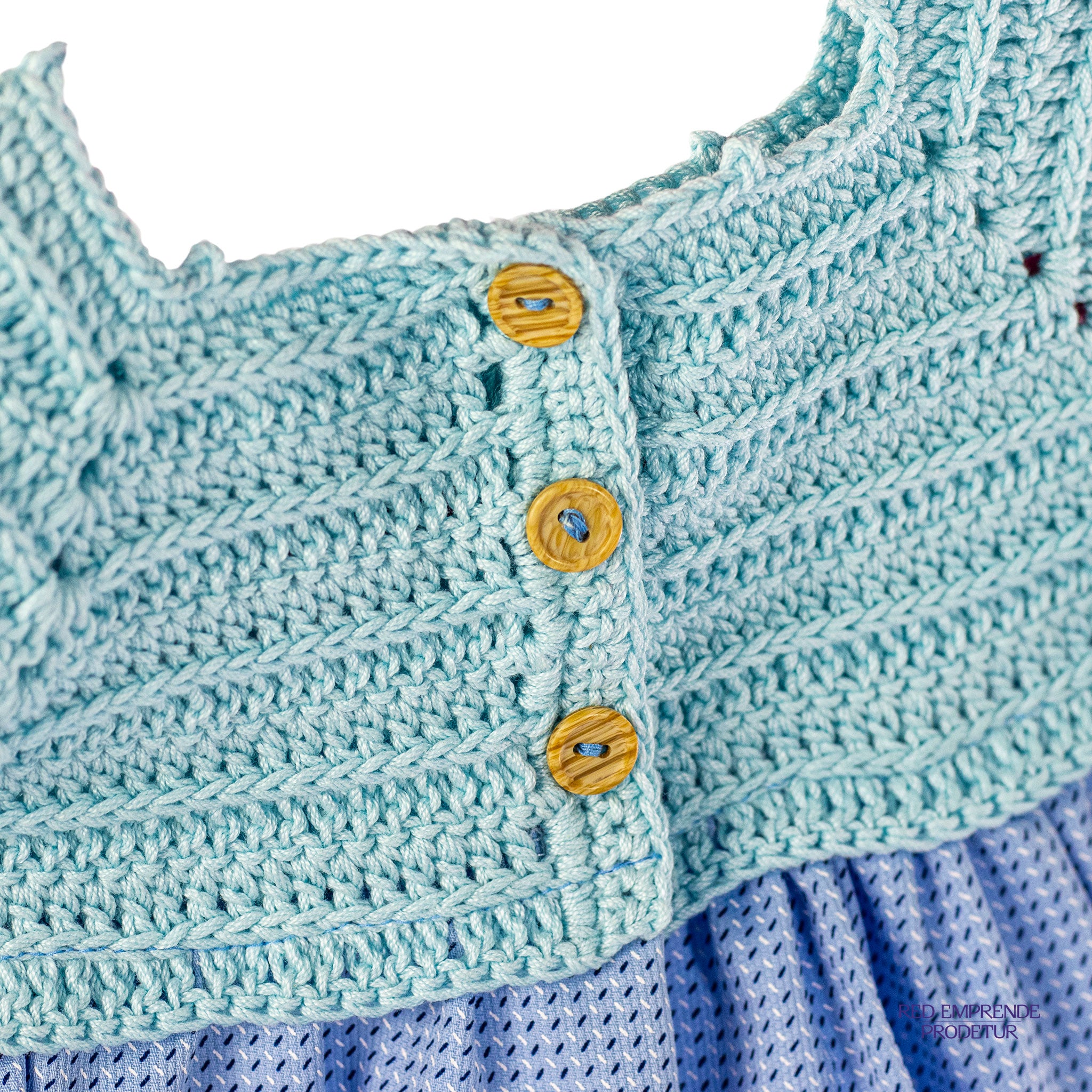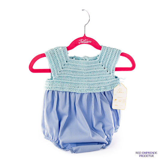 Traje azul unisex estilo bombachita, con tela de color celeste con detalle blanco (líneas, puntas o lunas), tejido en hilazo de algodón.